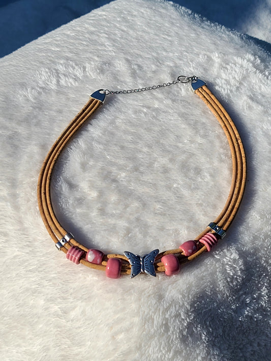 Handmade Fluttering Blossoms: Cork Necklace with Pink beads & Butterflies.