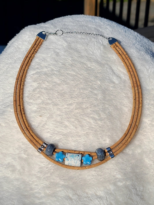 Handmade Sapphire Dreams Blue and White Beads with Stars Cork Necklace